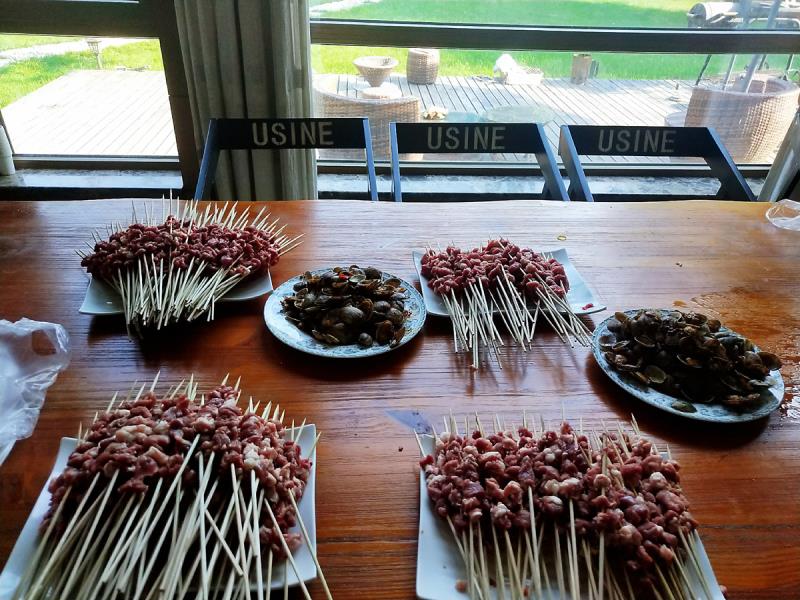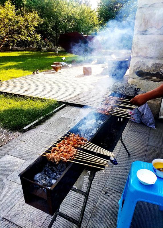 一邊串肉串一邊烤
